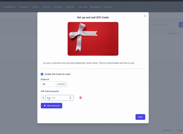 3. In the opened modal window by clicking on the "Enable Gift Cards for sale?" checkbox you can enable or disable the purchase of new gift cards for people. By default, gift cards are enabled for purchases. The following field is "Expire in". By changing the number you set how long (in months) the gift card will be available for redemption. If the gift card expired, the customer will not be able to use it anymore. By Clicking 'New Amount' add the gift card amounts available for purchase. By clicking the "trash icon" near the field, remove the amount available for purchase.